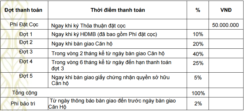 Khách hàng cần đặt cọc 50.000.000 VNĐ (Năm mươi triệu đồng) ngay khi ký Thỏa thuận đặt cọc để giữ chỗ. Phí này sẽ được trừ vào đợt thanh toán đầu tiên nếu ký Hợp đồng mua bán.