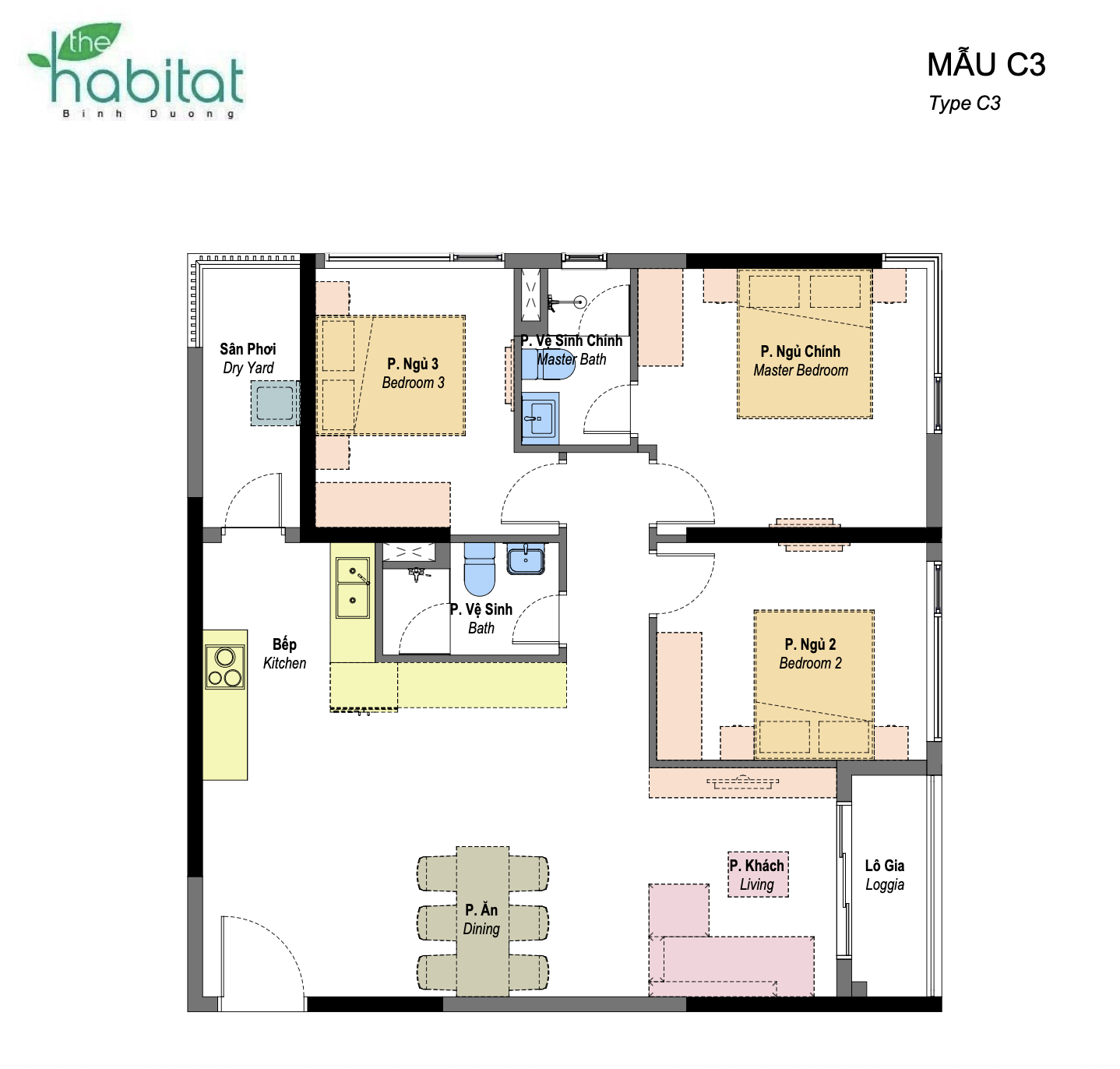 • Công năng: Bố cục rõ ràng với phòng khách, phòng ăn rộng rãi. Cả ba phòng ngủ đều được đảm bảo ánh sáng tự nhiên. Phòng ngủ Master thường có WC riêng biệt, tăng tính tiện nghi.